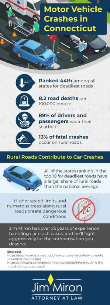 Motor vehicle crash cases are complex, and you need the help of an experienced vehicle accident lawyer to fight on your behalf. Don’t go it alone. Call 203.701.9676 for a complimentary initial consultation with experienced attorney Jim Miron. Jim helps crash victims from across Connecticut, including the Greater Bridgeport, New Haven, Stamford and Waterbury communities.